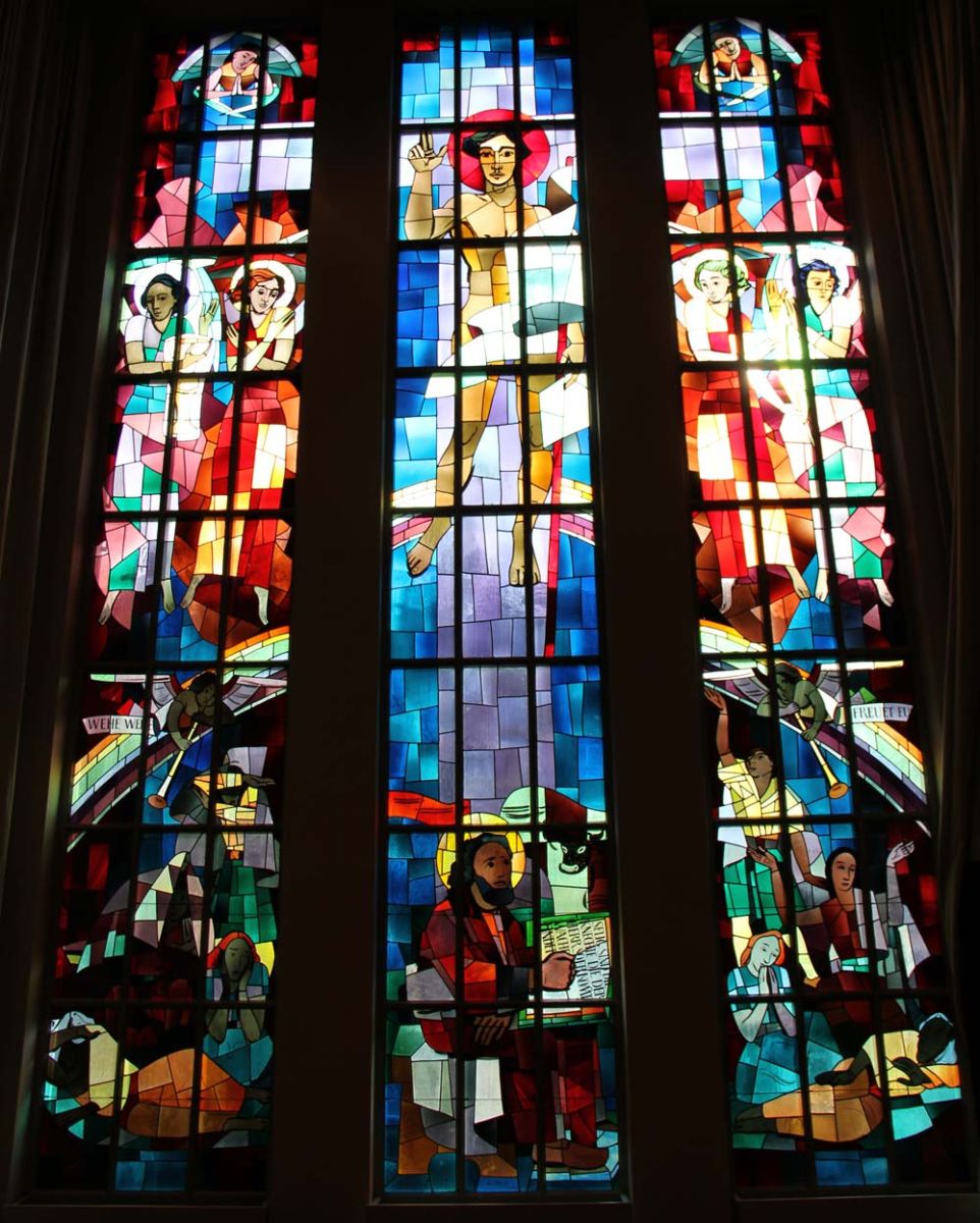 Für das monumentale, dreiteilige Chorfenster der Lukaskirche übernahm Moilliet die Grundgedanken der alt- und neutestamentlichen Überlieferung. Mit der überhöhten Darstellung einer zentralen Christusgestalt – als der Auferstandene mit weisser Fahne – bringt er aber eine zusätzliche Dimension in die Bildaussage. Der aufsteigende Christus symbolisiert den Anbruch einer neuen Welt, das Kommen der „Letzten Dinge“. Moilliet schrieb später in einem Brief: «Der lehrende Christus, hinweisend nach oben und unten zugleich, verkörpert den Gedanken der Allgegenwart Gottes. Dass das Oben und das Unten in der Gottesnähe dasselbe sind, die göttliche Kraft überall tätig, lebendig ist.» (Brief vom 24. Juli 1944)