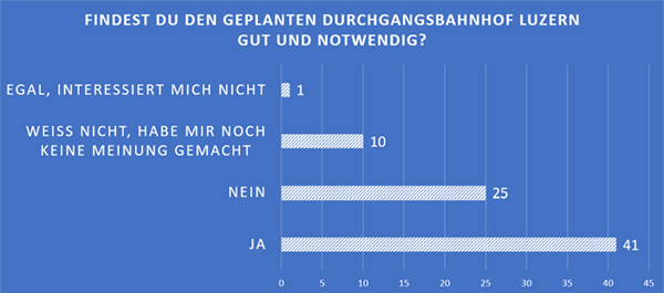 Liebe Mitglieder Wer sich noch nicht für die Generalversammlung am Mittwoch 20. März 2024 im ehemaligen Kino Modern angemeldet hat, kann dies noch bis am 13. März online tun: www.hirschmatt-neustadt.ch/gv Wenn du nicht sicher bist, ob du dich schon angemeldet hast, so kannst du dich gerne nochmals anmelden, wir werden dann die Liste mit doppelten Einträgen bereinigen :-) Wir freuen uns auf möglichst viele Mitglieder! Resultate Stimmungsumfrage zum Durchgangsbahnhof Wir haben unsere Mitglieder gefragt, was sie vom geplanten Durchgangsbahnhof halten. Die Umfragemail ging an 265 Mitglieder (wir haben nicht von allen Mitgliedern die E-Mail Adresse und bei den Doppelmitgliedern ist nur eine E-Mail Adresse hinterlegt). Wir erhielten 77 Rückmeldungen, was einer Quote von 29% entspricht. Ganz herzlichen Dank an dieser Stelle für alle Rückmeldungen! Ergebnisse aller teilnehmenden Mitglieder Über alle teilnehmenden Mitglieder gesehen sagen 53.2% Ja zum Durchgangsbahnhof, 32.5% Nein und 14.3% haben sich noch keine Meinung gebildet oder es ist ihnen egal. ![]() Ergebnisse teilnehmende Einzel- oder Doppelmitglieder Wenn wir die Ergebnisse der teilnehmenden Einzel- und Doppelmitglieder anschauen, so ist die Zustimmung höher, 66.7% sagen Ja, 25.0% Nein und 8.3% haben sich noch keine Meinung gebildet oder es ist ihnen egal. ![]() Ergebnisse teilnehmende Firmenmitglieder Gerade umgekehrt ist es bei den teilnehmenden Firmenmitglieder. Da sagen nur 31% Ja, die Mehrheit mit 44.8% Nein und 24.2% haben sich noch keine Meinung gebildet zum Durchgangsbahnhof. ![]() Es gab eine Rückmeldung mit der Bemerkung, dass die Frage mit «gut und notwendig» etwas suggestiv sei. Das können wir nachvollziehen, zudem sind es zwei Fragen in einer. Der Durchgangsbahnhof kann ja auch als notwendig aber nicht gut erachtet werden. Es war nicht unsere Absicht, die Resultate mit der Formulierung der Frage zu beeinflussen. Aber wir gehen davon aus, dass diese Formulierung nicht zu einer Verzerrung der Resultate führte. Alle Rückmeldungen wurden zwischen dem 16. und 27. Februar 2024 gemacht. |