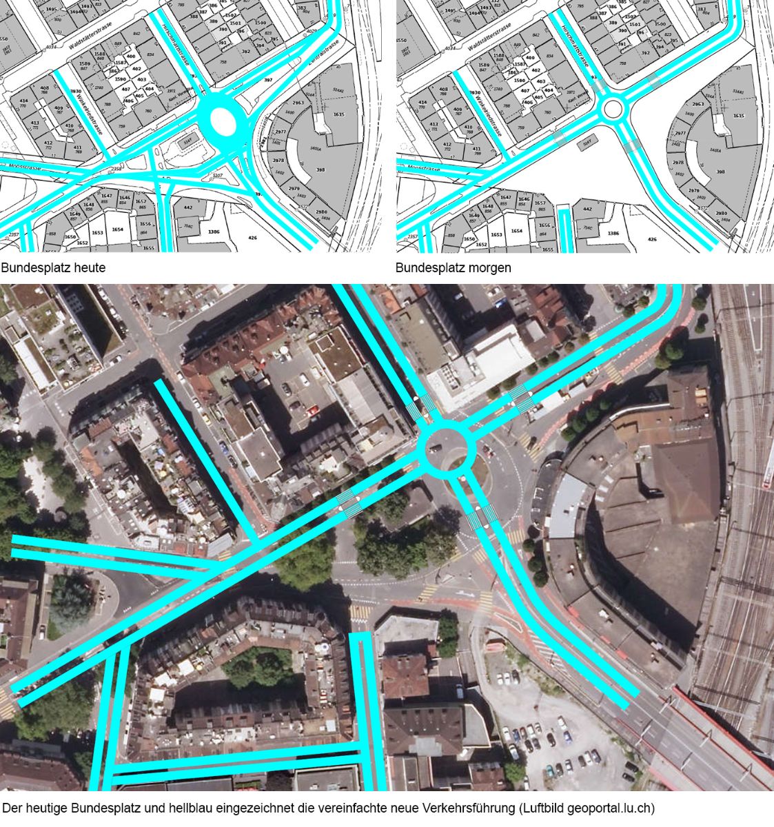 Gemäss Verkehrsmodell Agglomeration Luzern von 20121 ist das Verkehrsaufkommen am Kreuzstutz ungefähr gleich hoch wie beim Bundesplatz. Auch alle Zufahrtsstrassen sind zweispurig und werden es auch in Zukunft sein. Wir haben den Kreisel am Kreuzstutz in seiner Grösse 1:1 über den Bundesplatz skizziert und die zweispurigen Zufahrtsstrassen bis zum Kreisel verlängert, also quasi die Verkehrsfläche am Kreuzstutz auf den Bundesplatz übertragen. Das Resultat: Es wird viel Fläche frei auf dem Bundesplatz – Fläche, die sinnvoller genutzt werden kann als nur für den Strassenverkehr.