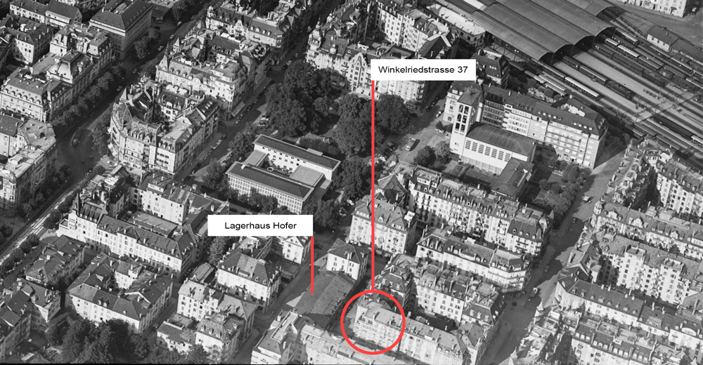 Das Haus Winkelriedstrasse in einer Luftaufnahme von 1953. Links davon ist das Lagerhaus Hofer zu sehen (heute Murbacherstrasse 21 und 23).