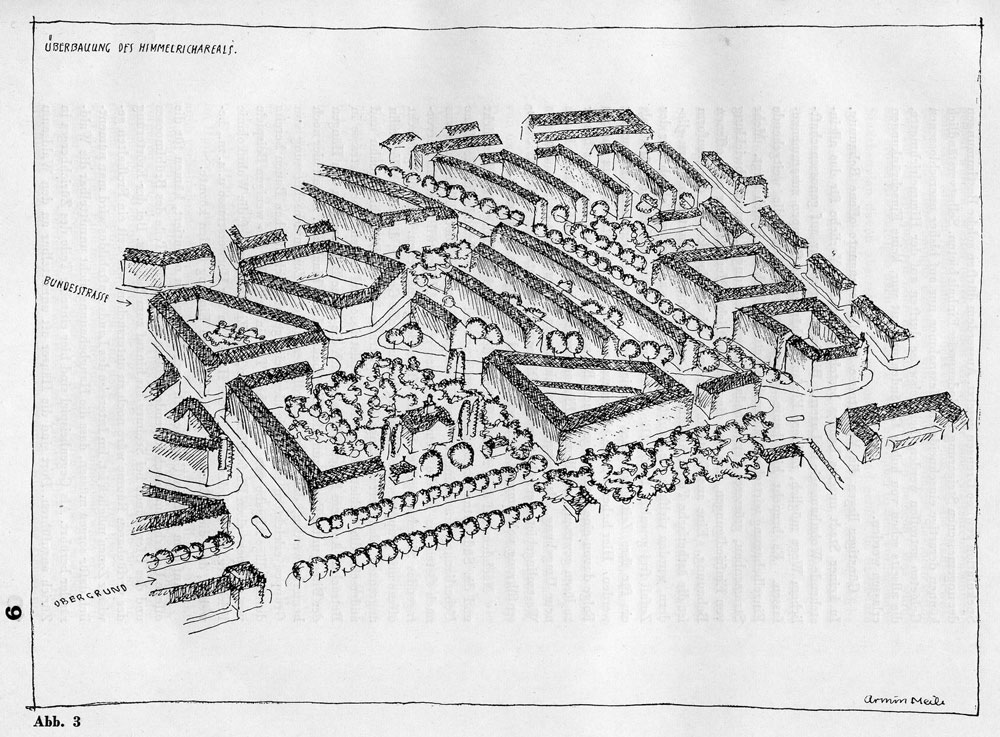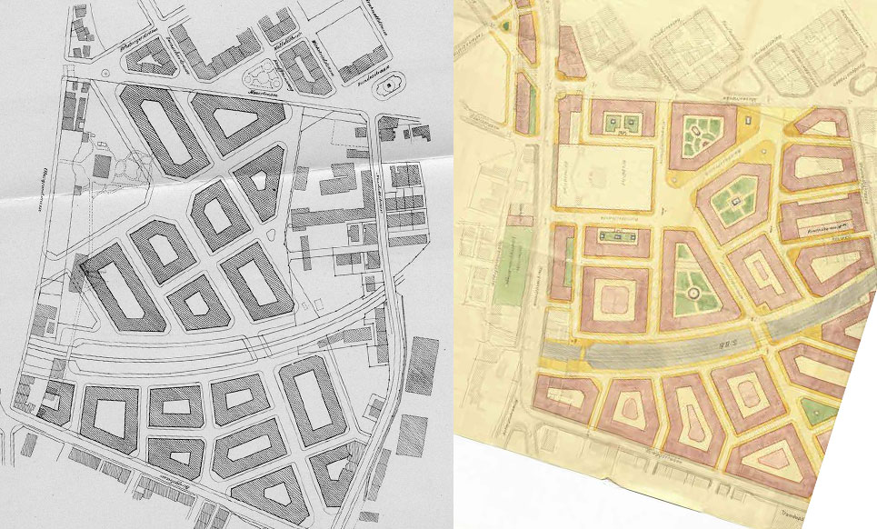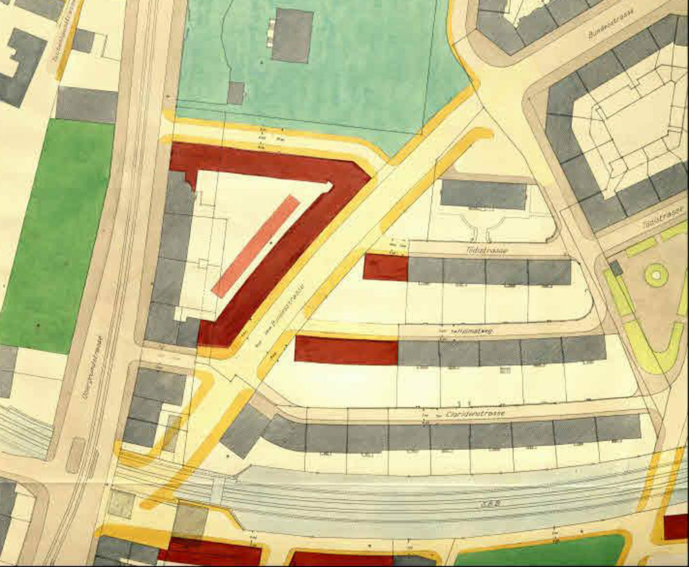 Die Zeilenbauten der Himmelrich-Überbauung auf dem Stadtbebauungsplan von 1931/33.