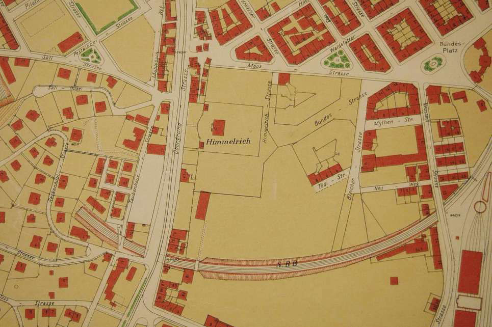Auf dem Stadtplan von 1912 ist die Himmelrichmatte in ihrem Kernbereich noch unbebaut. Geplant ist die Verlängerung der Bundesstrasse.