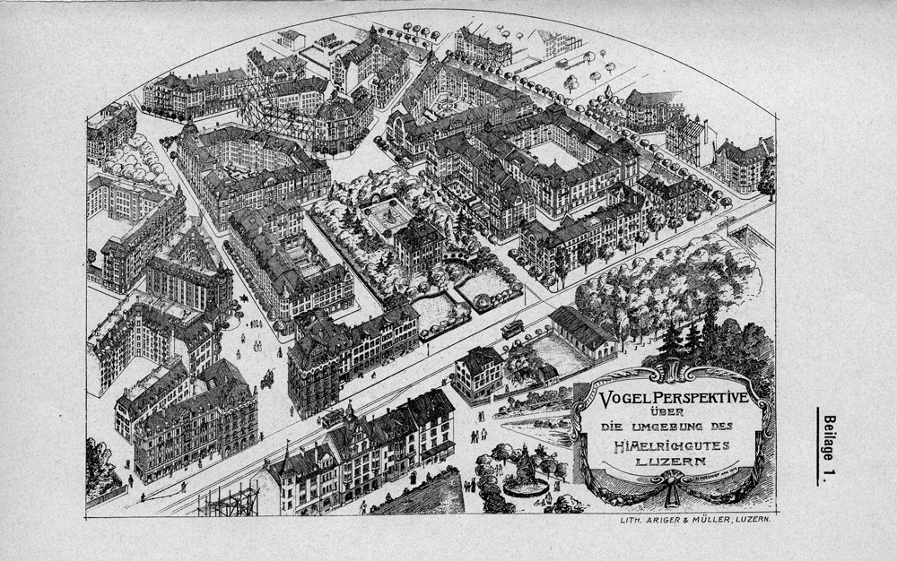 Noch in den späten Vierzigerjahren schwärmten die Alteingesessenen von der grünen Himmelrichmatte, die «sich früher zwischen der Moos- und der Bireggstrasse, dem Obergrund und der Neustadt weiträumig ausdehnte». «Sattgrün und baumbestanden gab sie vom Helvetiagärtli den Blick gegen die Alpen frei, dann gegen die Bauten, die die Bireggstrasse säumten, und schliesslich gegen den Pilatus, der von alters her auf die fette Trift [Weide] herniederschaute.» So schrieb es Anton Muheim, Präsident der «Allgemeinen Baugenossenschaft Luzern» (ABL) und Mitglied des Stadtrates, in der «Geschichte des Hirschmatt- und Neustadtquartiers» von 1949.