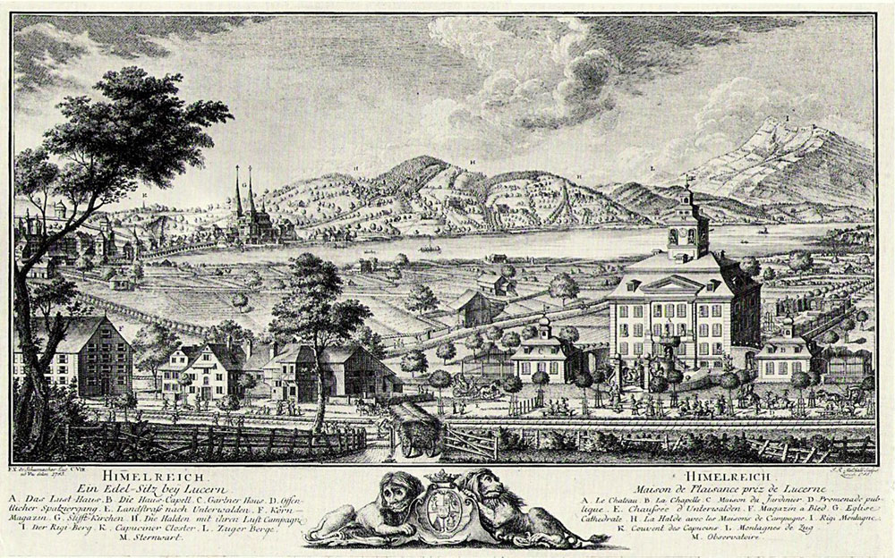 Himmelrichmatte mit Herrenhaus auf einem Kupferstich von Franz Xaver von Schumacher von 1783. Das Herrenhaus steht heute noch an der Obergrundstrasse.
