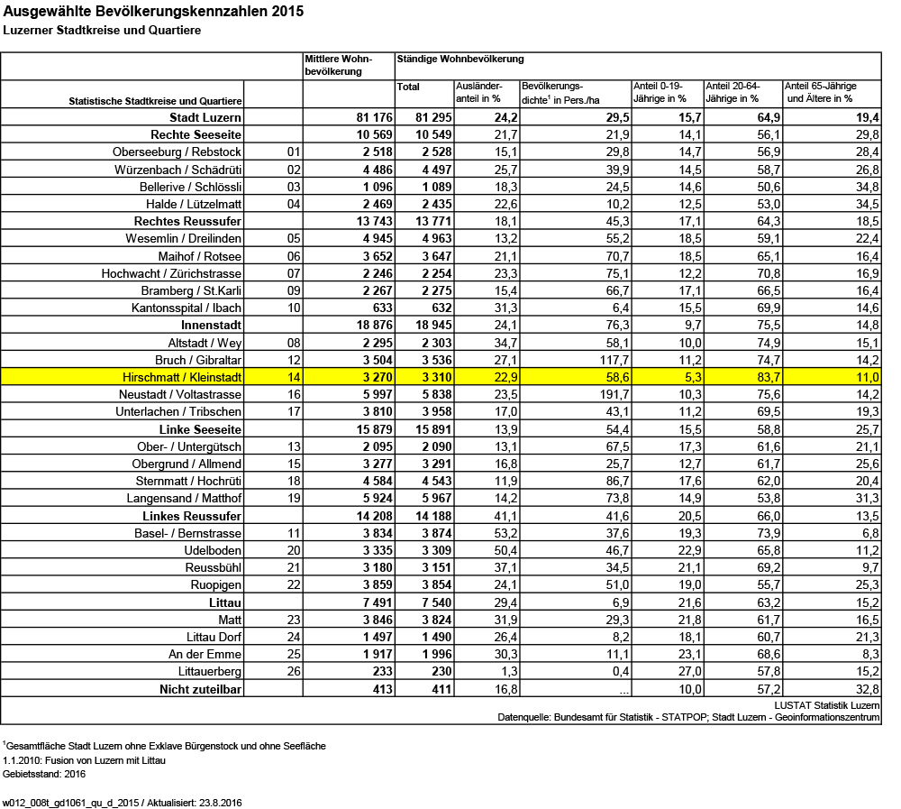Damit sollte er Recht behalten. Heute ist das Hirschmattquartier in fast allen Statistiken – etwa beim Ausländeranteil oder dem Abstimmungsverhalten – nicht weit vom städtischen Durchschnitt entfernt. Mit einer Ausnahme: Der Anteil der Kinder und Jugendlichen (bis 19 Jahre) beträgt nur gerade 5,3 Prozent. Dies ist mit Abstand der tiefste Wert aller Quartiere. Der städtische Durchschnitt liegt bei 15,7 Prozent.